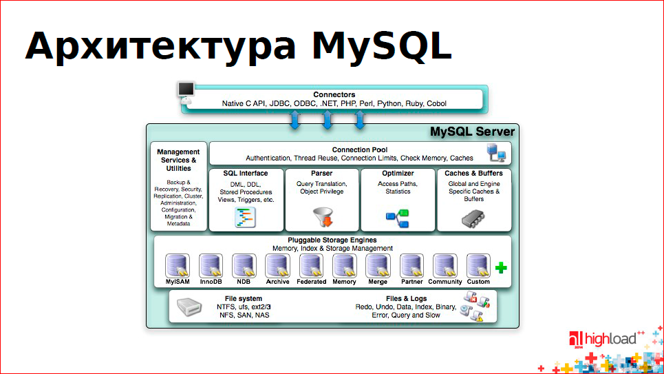 На рисунке вы можете видеть штуку, которая называется Storage Engines: это такая сущность, которая занимается вопросами, как писать данные на диск и как нам их оттуда читать, как по ним искать и пр.