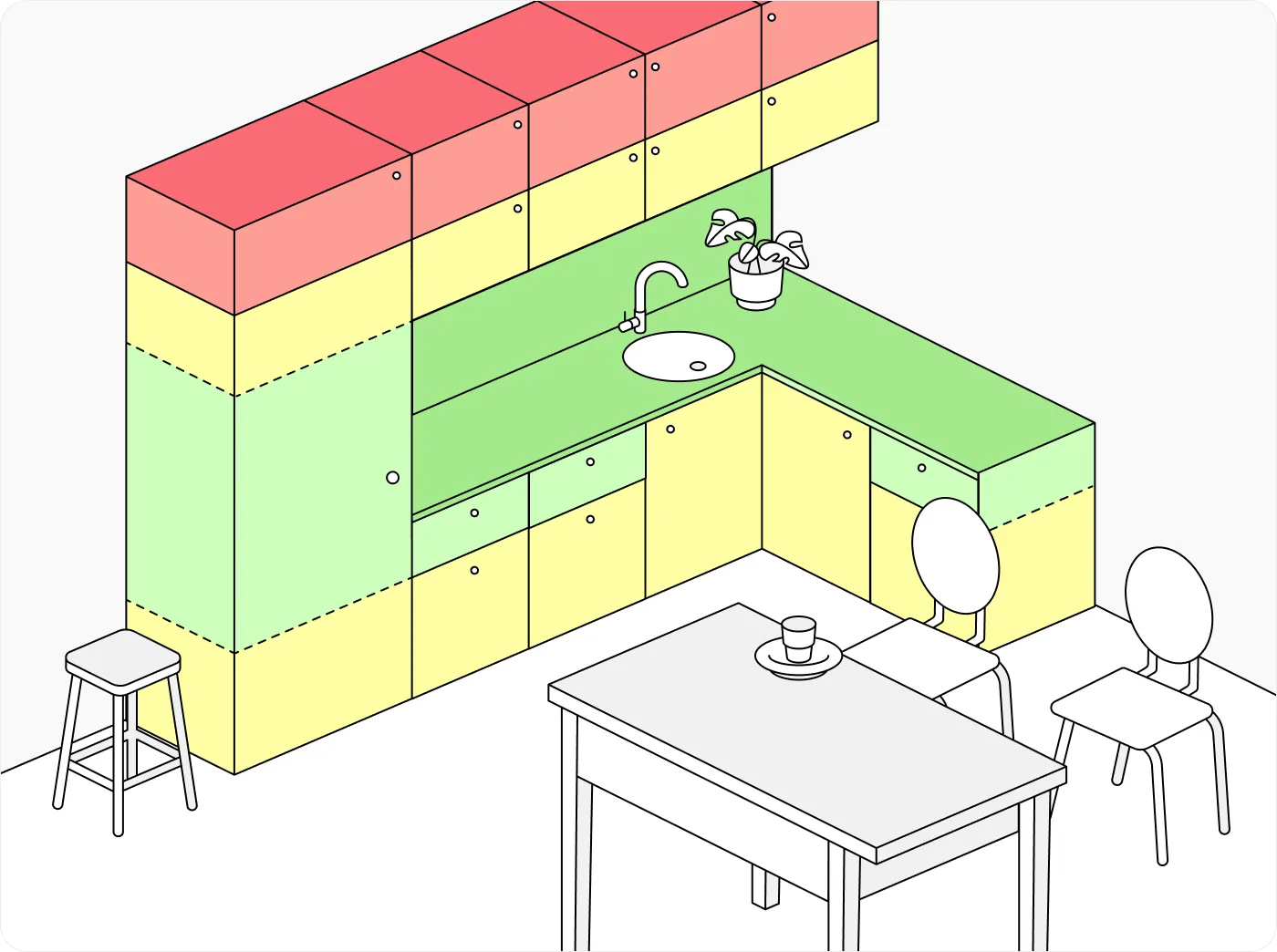 - Красная зона: предназначена для редко используемых вещей, например, праздничного сервиза. Их стоит хранить на верхних полках или антресолях.
