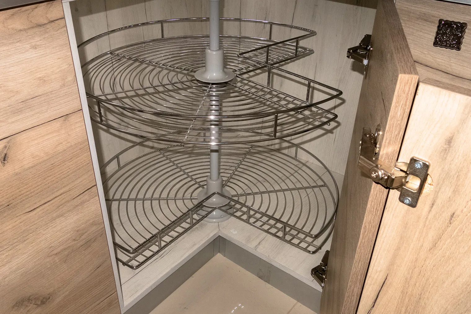 Избегайте образования «мертвых» зон в углах кухни. В этих местах можно установить выдвижные ящики нестандартной формы или вращающиеся полки, что позволит максимально использовать доступное пространство. В нижних шкафах вместо полок с распашными дверцами предпочтительнее установить выдвижные ящики — это упростит доступ к содержимому и сократит время на поиск нужных предметов.