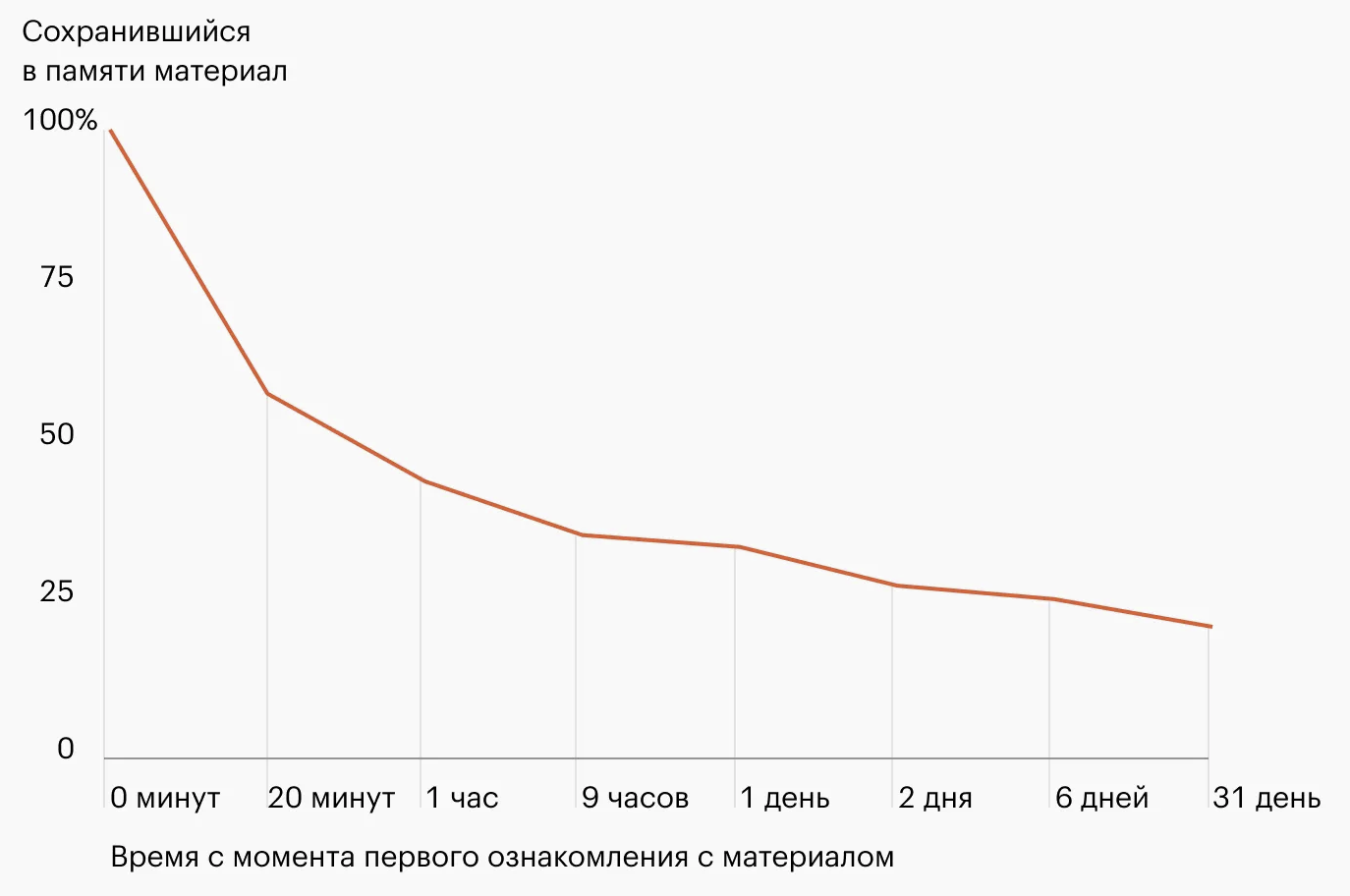 Забывание — естественный процесс работы памяти. При однократном взаимодействии с новой информацией человек теряет до 75–80% этого материала уже через 6–10 дней. Такая закономерность описана в классической кривой забывания Эббингауза, которая показывает, насколько быстро исчезает из памяти то, что не было повторено или осмысленно обработано.