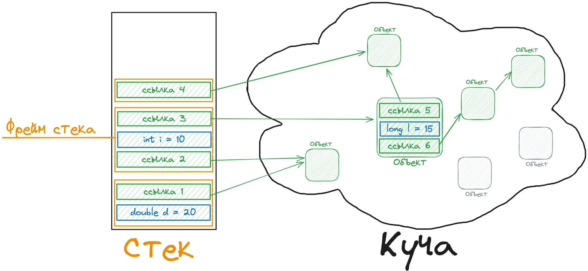 Для наглядности представим стек и кучу. Серые объекты потеряли свою связь со стеком, и их нужно удалить, чтобы освободить память для новых объектов.
