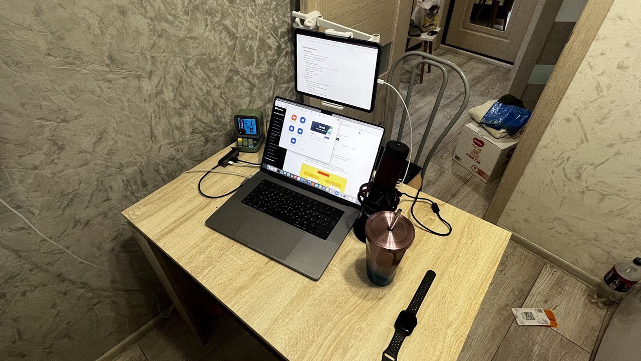 Позже на кухне сделали ремонт. Теперь у меня был MacBook с 15-дюймовым экраном (и 1 Tb памяти 😁), а я уже дорос до уровня Middle+. Стало намного комфортнее работать. Появились iPad в качестве второго монитора и микрофон, что особенно помогало при проведении Q&A сессий со студентами в Я.Практикуме.