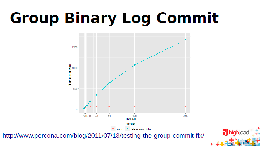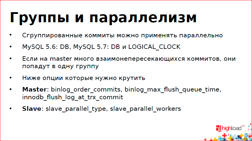Грустно, что приходится так делать из-за разделения – Storage Engine внизу, репликация наверху. С этим все плохо. В MySQL 5.6 и 5.7 эта проблема решена – есть Group Binary Log Commit, и мастер теперь не отстает. Теперь это пытаются использовать для параллелизма репликации, чтобы на слэйве запросы из одной группы запустить параллельно. Тут я написал, что из этого нужно крутить: