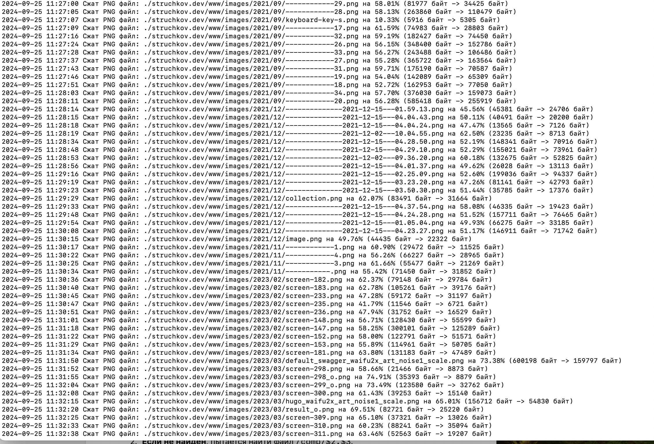 Данный скрипт предназначен для автоматического сжатия изображений форматов PNG и JPEG в заданной директории. Он использует современные утилиты сжатия, обеспечивая уменьшение размера файлов без заметной потери качества. Это особенно полезно для оптимизации веб-сайтов, ускорения загрузки страниц и экономии дискового пространства.