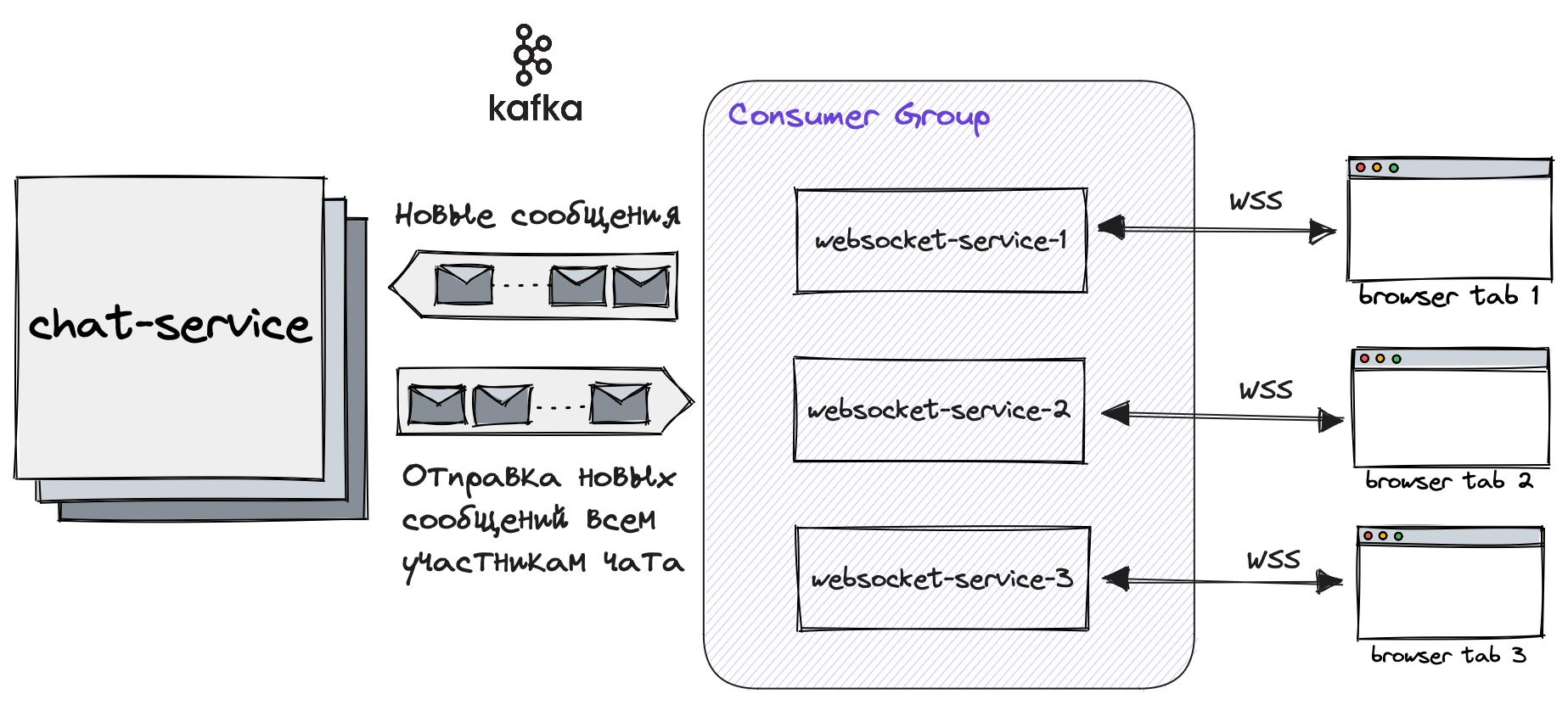 Бизнес-сервис обрабатывает сообщение и отправляет его обратно во все реплики WebSocket-сервиса, чтобы сообщение было доставлено всем участникам чата. Для того чтобы все реплики WebSocket-сервиса получали сообщение одновременно, можно использовать Kafka Consumer Group.