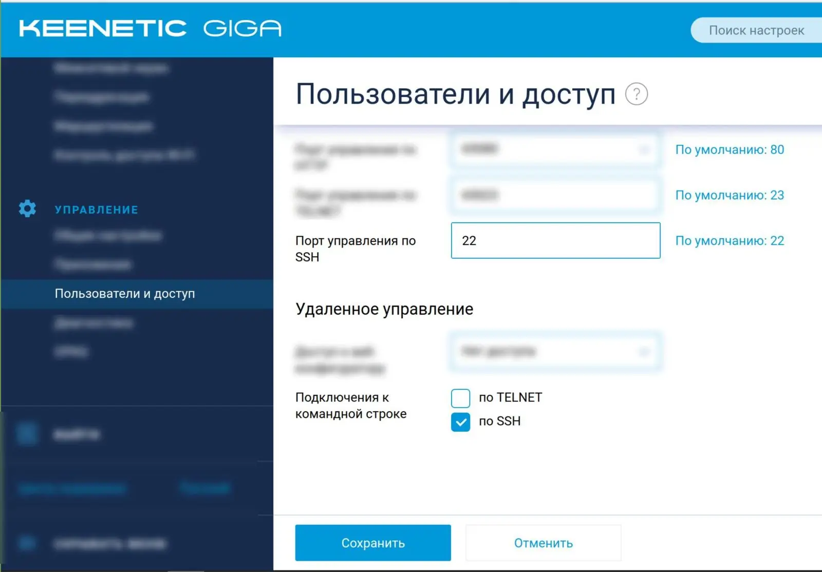 Если доступа в консоль нет, то его надо включить. Для этого перейдите в раздел “Управление” “Пользователи и доступ”. Проверьте что установлен порт управления по SSH и активирован пункт “Подключения к командной строке по SSH”.