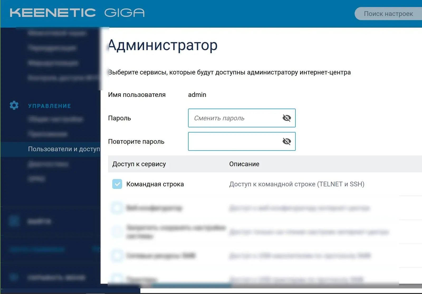 Также убедитесь, что у вас есть пользователь, у которого есть права входа через SSH. На той же странице у вас есть список пользователей. Зайдите в редактор прав пользователя, и убедитесь что у него активирован пункт “Доступ к командной строке (TELNET и SSH)”.