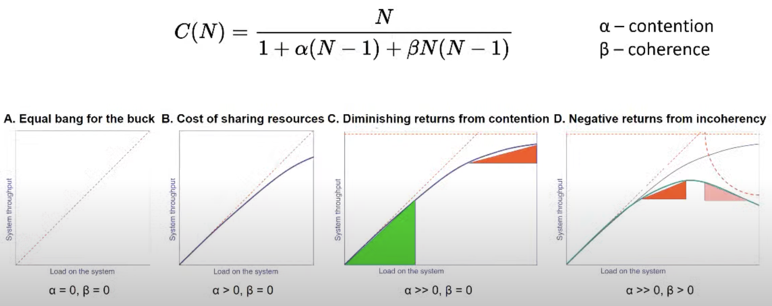 - Увеличение конкуренции за ресурсы (Contention) — чем больше ресурсов добавляется в систему, тем чаще они конкурируют за одни и те же ресурсы (например, память или сеть), что ограничивает прирост производительности.