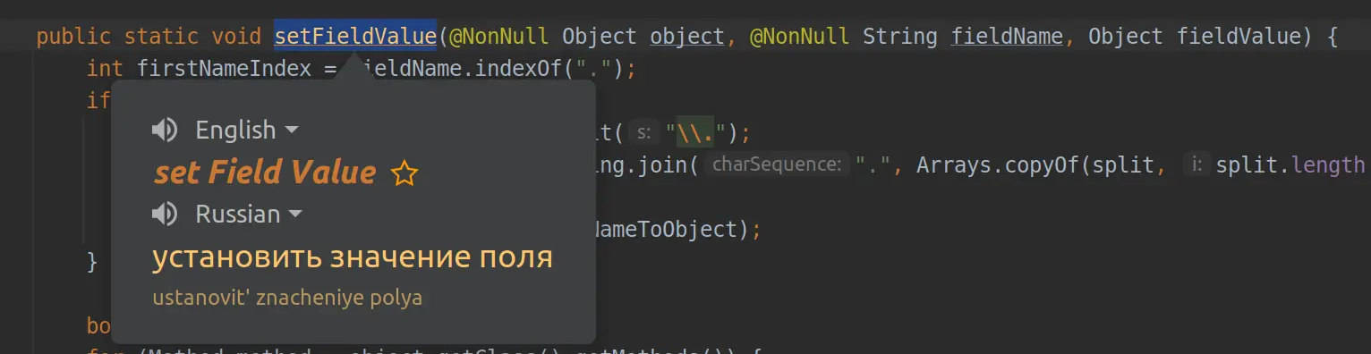 Если у вас все печально с английским, то вам часто приходится перемещаться между Idea и переводчиком в браузере. Translation избавляет вас от этой проблемы.